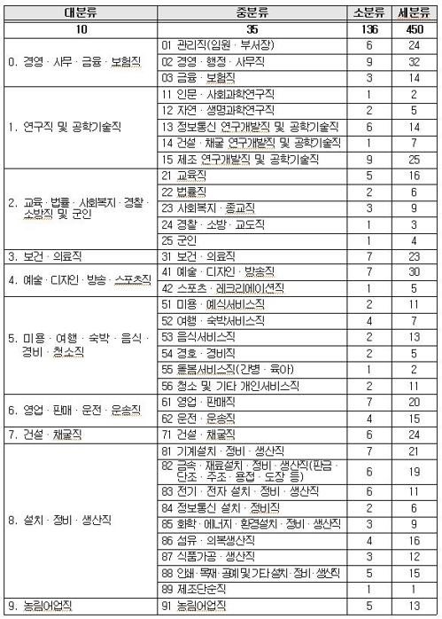 Çѱ¹°í¿ëÁ÷¾÷ºÐ·ù(KECO)ÀÌ °³Á¤µÈ ³»³â Á÷¾÷ºÐ·ù´Â ´ëºÐ·ù 10°³, Áߺзù 35°³, ¼ÒºÐ·ù 136°³, ¼¼ºÐ·ù 450°³·Î ³ª´¶´Ù.